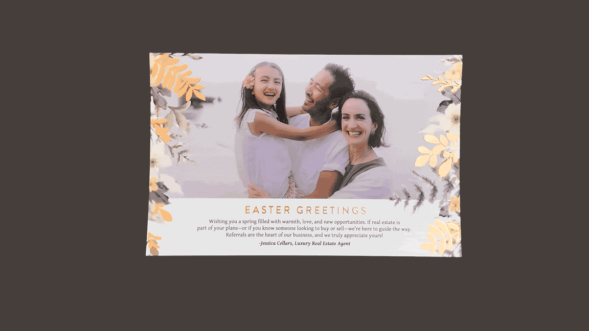 Enhance your real estate marketing with high-end foil and varnish postcards designed for maximum impact. Whether promoting a listing, hosting a community event, or sending seasonal mailers, these premium postcards ensure you and your brand stand out.